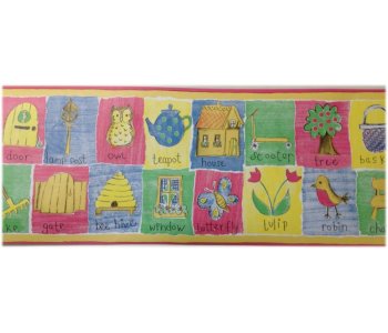 , a delightful wallpaper border featuring a vibrant and playful word and picture theme that is sure to captivate younger kids. Let their imagination run wild with this colorful design that will instantly brighten up any room.