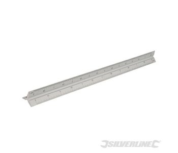 Cast aluminium scale rule with triangular body for safer cutting and scoring of materials.