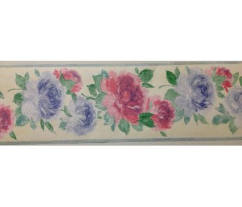 73692 Crown Wallpaper Vinyl Border. Border with a light yellow background and a light blue trim with a light blue and pink flower design with green leaves on a pale background. Pattern repeat: 26.5cm.5 meters in length. 12.7cm in height.