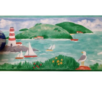 77671 Crown Vinyl Wallpaper Border.This border is in a costal scene with lighthouse, seagulls and boats. Pattern repeat 53cm. 5 meters in length. 26 cm in height.