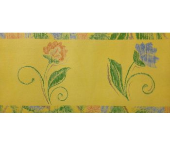 Transform your walls with the Coloroll LA Baule Floral Wallpaper Border. This charming wallpaper border features a large flower design in vivid blue and soft peach hues against a vibrant yellow background, creating a graceful and cheerful ambiance in any room.