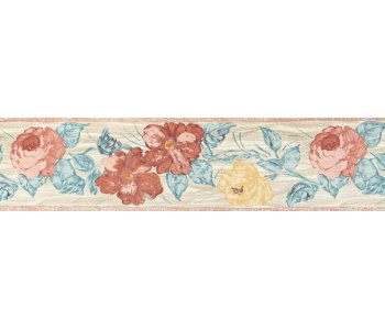 18.75Metres. The 85287 Shand Kydd Ready Pasted Vinyl Wallpaper Border features a floral pattern in shades of pink, dusky red, aqua, warm yellow, taupe, and natural.