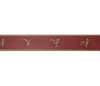 903107 Debona Sappord Red and Gold Oriental Writing Border.A textured border with gold Oriental writing and edge, on a red textured background.Spongable.Paste the border.Roll size; 5 mitre.Roll height; 13.3cm.Repeast pattern; 64.5cm.