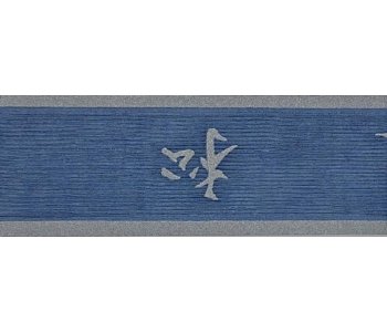 903108 Debona Sappord Blue and Silver Oriental Border.A textured border with silver Oriental writing and edge, on a blue textured background.Spongable.Paste the border.Roll size; 5 mitre.Roll height; 13.3cm.Repeast pattern; 64.5cm.