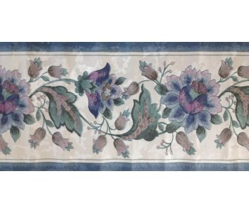 The 9099 Pride Heritage Collection Floral Vinyl Border is a beautiful addition to any room, featuring a floral pattern in shades of blue, green, pink, plum, and off white.