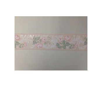 A delightful pastel colour border in a pale natural backround with shades of pink flowers and green leaves, with a tiny stitch like design.