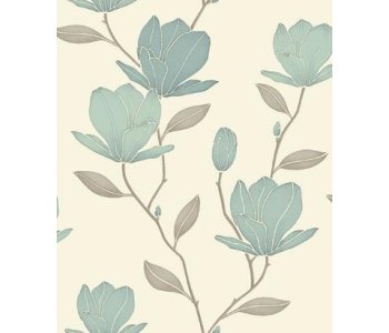 Introducing the 96371 Teal and Cream wallpaper, a sophisticated and elegant choice for your living space. This high-quality printed wallpaper features a beautiful floral trail design from the East of Eden collection. The wallpaper showcases teal-coloured magnolia-style flower heads with mocha stems and leaves on a mica cream background, creating a serene and timeless look.