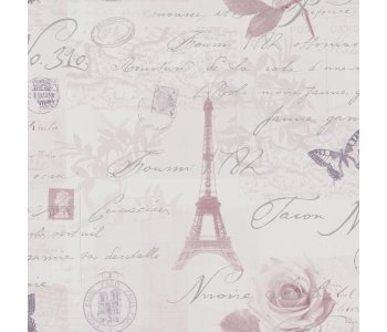 Introducing the 97751 Calligraphy Heather Wallpaper, a charming addition to your interior decor! This quirky wallpaper showcases a subtle French-inspired design featuring stamps, roses, maps, and the iconic Eiffel Tower, all set against a soothing heather background.