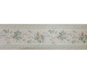The border design is reminiscent of traditional or antique wallpaper borders. It has a timeless, classic appeal that would complement traditional or vintage interior decor. Overall, the border design is refined and delicate, with a focus on floral motifs and a soft colour scheme that enhances its classic and sophisticated look.