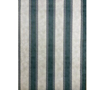 Mottled effect striped wallpaper in alternating deep green and ivory with a deep blue ribbon effect pinstripe between.