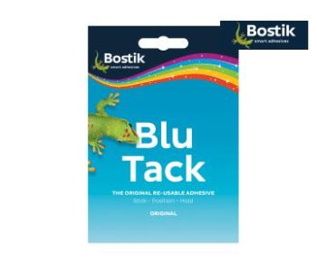 Bostik Blu Tack© is a permanently plastic, reusable adhesive supplied in the form of rectangular slabs between sheets of release paper. Packed in individual wallets, Blu Tack© is both clean and economical in use. Clean, safe and easy-to-use. Provides an ideal alternative to drawing pins and sticky tape.