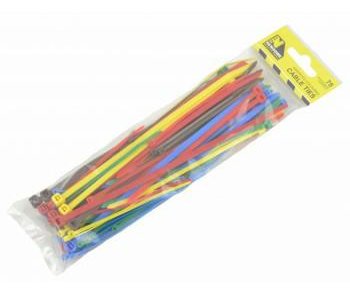 Assorted sized coloured cable ties. 75 cable ties per pack. Designed to secure cables, hoses and pipes quickly without slipping. Curved tip allows for faster threading and installation. Manufactured from nylon 66.
