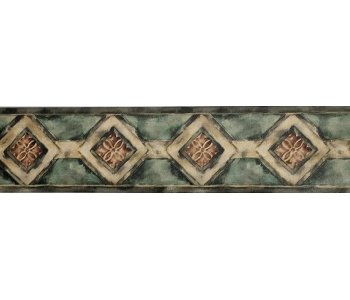 A diamond with in a diamond vinyl border with black outline and a design in brown at the centre on a mottled green background.