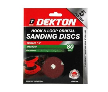 Dekton DT80706 125mm Hook and Loop Orbital Sanding Discs 80G Pack of 5Suitable for orbital sanders. Multi-surface sandpaper sheets for wood, metal, plaster, plastics, fibreglass, paint. Diameter 125mm.