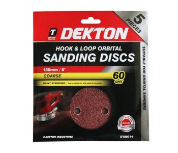 Dekton DT80714 150mm Hook and Loop Orbital Sanding Discs 60G Pack of 5Suitable for orbital sanders. Multi-surface sandpaper sheets for wood, metal, plaster, plastics, fibreglass, paint. Diameter 150mm.