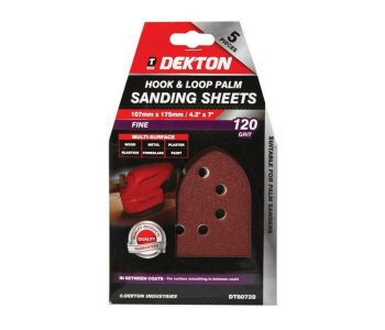 Dekton DT80728 Hook and Loop Palm Sanding Sheets 107mm x 175mm 120GSuitable for palm sanders. Multi-surface: wood, metal, plaster, plastics, fibreglass, paint. 107mm x 175mm.