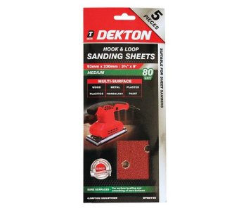 Dekton DT80746 Hook and Loop Sanding Sheets 93mm x 230mm 80G Pack of 5Suitable for sheet sanders. Multi-surface: wood, metal, plaster, plastics, fibreglass, paint. 93mm x 230mm.