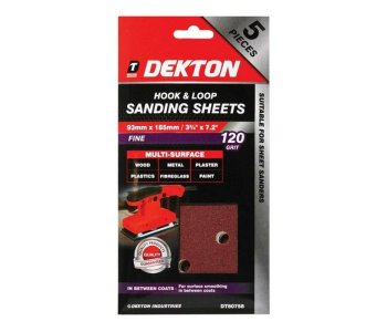 Dekton DT80758 Hook and Loop Sanding Sheets 93mm x 185mm 120G Pack of 5Suitable for detail sanders. Multi-surface: wood, metal, plaster, plastics, fibreglass, paint. 93mm x 185mm.