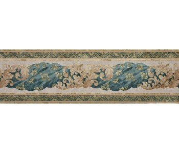 Country Decor Vinyl border in a green and turquoise design on a mottled beige background with shimmering gold finish.