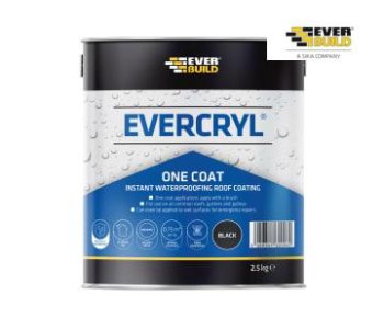 Everbuild EVERCRYL© is a resin-based, fibre reinforced roof repair compound which is effective on all common roofing surfaces and types, giving an instant roof repair even in the wet and on wet surfaces. EVERCRYL© may also be applied in frosty conditions down to -5øC. EVERCRYL© One Coat is instantly waterproof when applied, so there is no fear of wash off. Emergency leaks can be tackled immediately as there is no need to wait for the rain to stop. EVERCRYL© One Coat is brush applied and dries to a smooth seamless flexible membrane which resists algae and fungal growth. Because of the high level of fibre reinforcement, EVERCRYL© One Coat will bridge small cracks and requires only a one coat brush application to give instant and total water protection, even in areas subject to ponding. EVERCRYL© One Coat requires no primer on sound, non-porous surfaces.