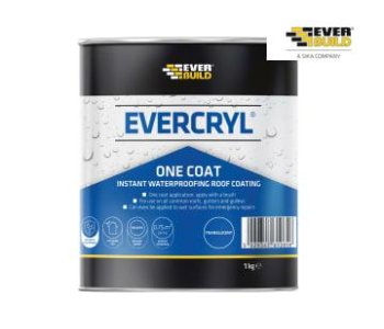 Everbuild EVERCRYL© is a resin-based, fibre reinforced roof repair compound which is effective on all common roofing surfaces and types, giving an instant roof repair even in the wet and on wet surfaces. EVERCRYL© may also be applied in frosty conditions down to -5øC. EVERCRYL© One Coat is instantly waterproof when applied, so there is no fear of wash off. Emergency leaks can be tackled immediately as there is no need to wait for the rain to stop. EVERCRYL© One Coat is brush applied and dries to a smooth seamless flexible membrane which resists algae and fungal growth. Because of the high level of fibre reinforcement, EVERCRYL© One Coat will bridge small cracks and requires only a one coat brush application to give instant and total water protection, even in areas subject to ponding. EVERCRYL© One Coat requires no primer on sound, non-porous surfaces.