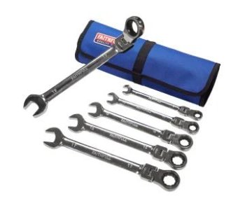The Faithfull Ratchet Combination Spanner Set in Tool Roll, 6 Piece, has a chrome vanadium finish and flexible ratchet heads, which can turn through 180ø, allowing them to be used in awkward to reach places at any angle.