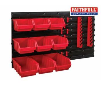 The Faithfull Wall Storage Bin Starter Kit contains 9 storage bins manufactured from robust polypropylene. These bins are acid, oil and solvent resistant. The interlocking design allows the bins to be stacked if required and each bin has a moulded-in label holder for easy item identification.