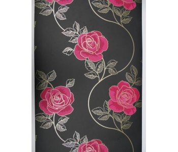 Bring the beauty of nature indoors with the FD14835 Rochelle Pink Flower Wallpaper. This exquisite wallpaper features a striking black background adorned with delicate two-tone pink flowers and detailed gold leaves outlined in gold. Ideal for creating a captivating feature wall in any room of your home, this wallpaper adds a touch of elegance and sophistication to your space.