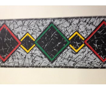 0066 Euro Jambaree Diamond Border. Green yellow and red diamond with a grey and black background.Paste the border.Peelable.Spongable.Colour fastness.Repeat pattern; 26.5cm.Roll length; 10 metre.Roll height; 13.3cm.