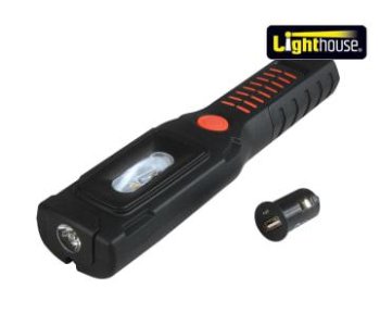 The Lighthouse Rechargeable Inspection Light features an SMD LED work light, providing a powerful 300 lumen output floodlight, along with a bright 100 lumen spotlight function. The inspection light features a powerful rechargeable 3.7V Li-ion 2200mAh battery that provides a run time of between 3 to 9 hours, depending on the function selected.