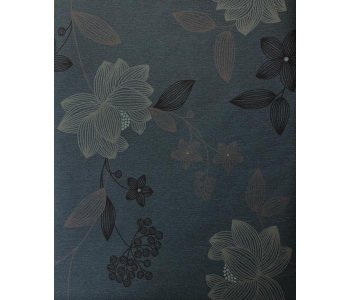 This exquisite wallcovering features an elegant air force blue background adorned with a stunning array of flowers, leaves, and stems in shades of beige, brown, and dark brown, accented with touches of luxurious gold decor.