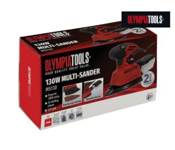 The Olympia Tools© Multi-Sander has a powerful 130W motor and uses a hook & loop sanding sheet fastening system. Its ergonomic, soft grip handle makes it easy to hold and provides precise handling. Fitted with a dust collection box to keep your working area clean and free from debris.