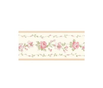 Painterly roses and small flowers flow through this border. Found between cascading rose buds on a plain background. They are bordered by soft watercolour-like stripes.