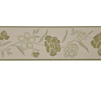 With shades of green flowers and leaves on a light cream weaved pattern background.