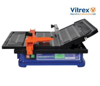The Vitrex 10 3402 NDE Torque Master Power Tile Cutter with a diamond cutting blade has a Hi-Torque gear for maximum cutting performance, and a splash guard with a variable height adjustment. Uses a 110 x 22mm diamond blade with continuous rim for extra clean cut, and has a fully adjustable mitre guide with unique ratchet mechanism.