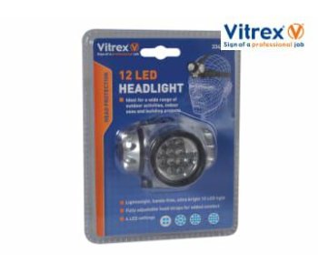 The Vitrex 334170 Headlamp is ideal for a wide range of outdoor activities, indoor uses and building projects. Made from lightweight, durable materials with fully adjustable head straps for added comfort. Offers 4 LED settings: 4 LED Beam (Square), 8 LED Beam (Circular,) 12 LED Beam(Square) and 12 LED Flashing.